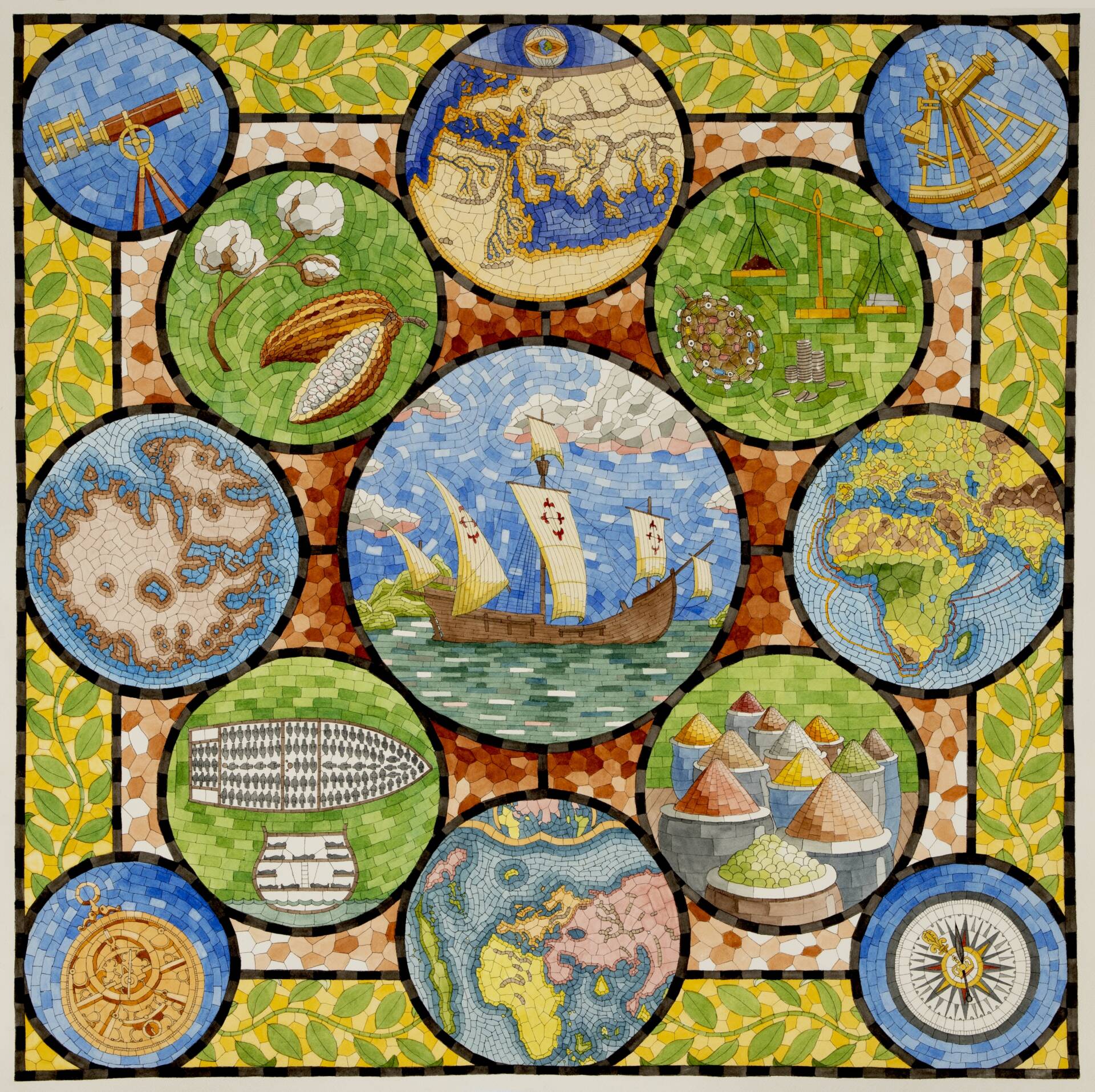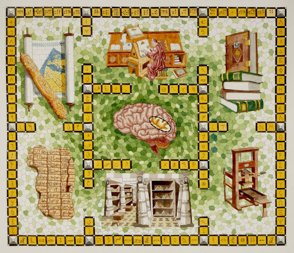 The Evolution of Knowing No. 8 – The Journey of Ancient Words, 2025 – Watercolor and pen, 34×34” (framed)
